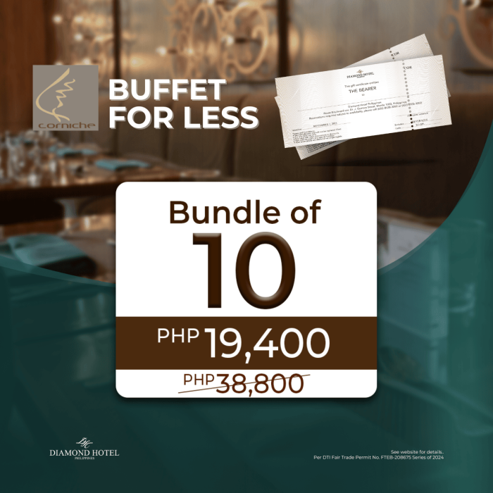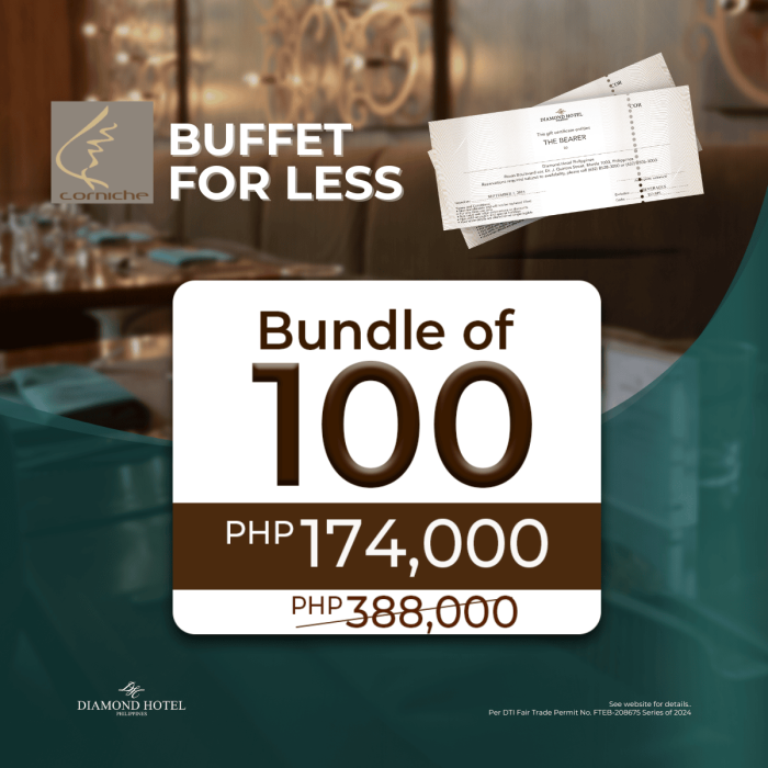 Bundle of 100 Corniche Lunch or Dinner Buffet Gift Certificate at Php 174,000